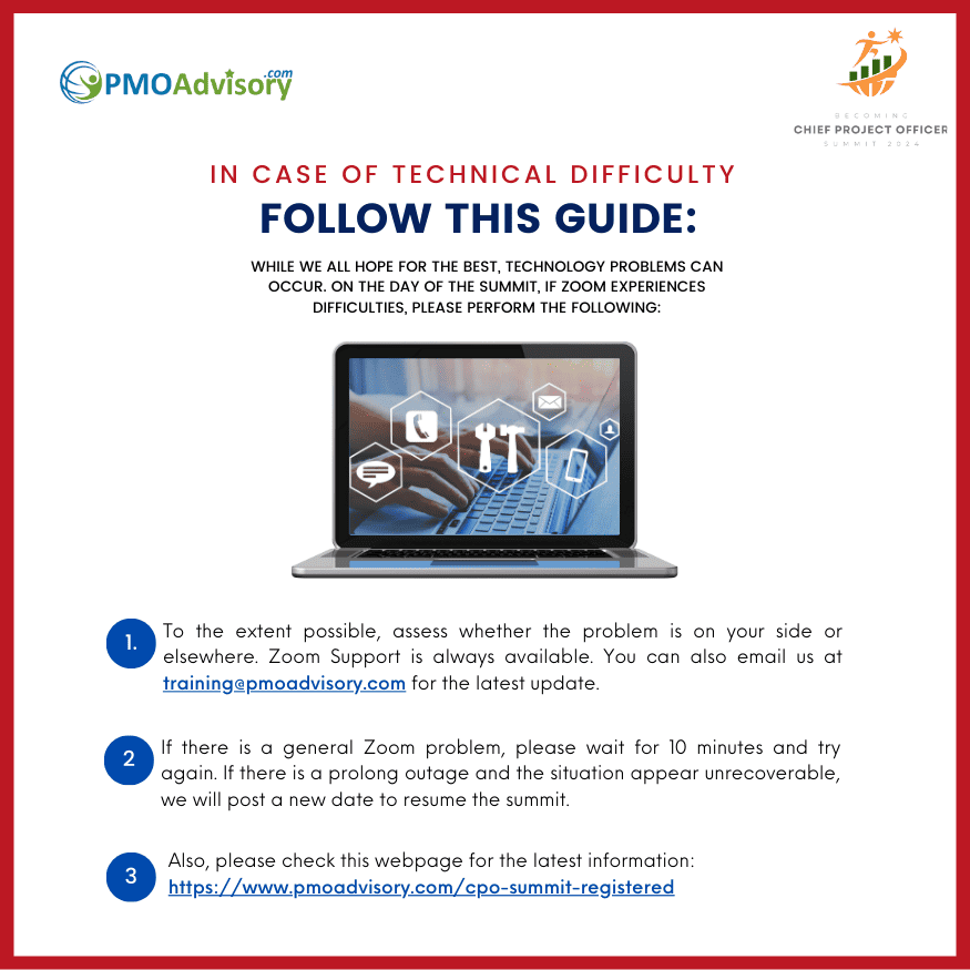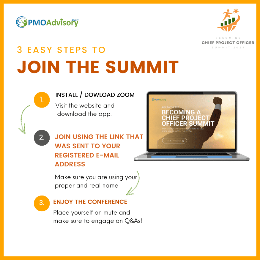 Thank you for registering for the Rising to the Top: Becoming A Chief Project Officer Summit. We are thrilled to remind you that the highly anticipated Rising to the Top: Becoming A Chief Project Officer Summit, hosted by PMO Advisory is a few days ahead. This page is designed to provide you helpful links, updates, and news about the upcoming summit. During the event, you can refer to our few guidelines, instructions for joining and even when you encounter a technical difficulty.